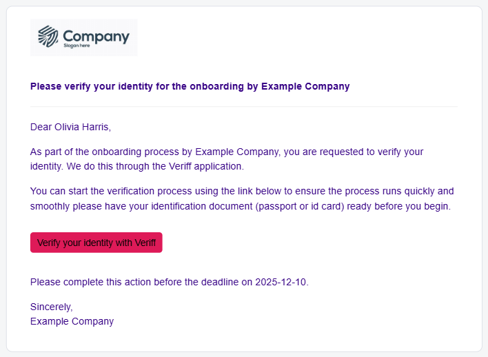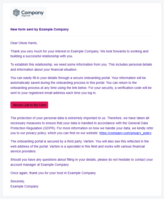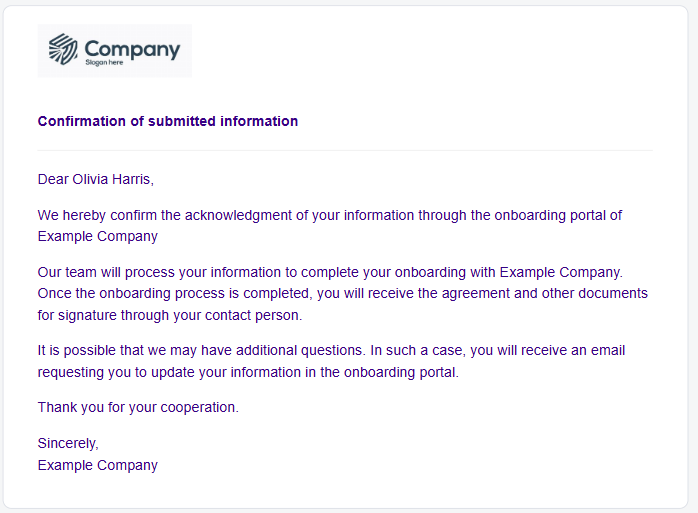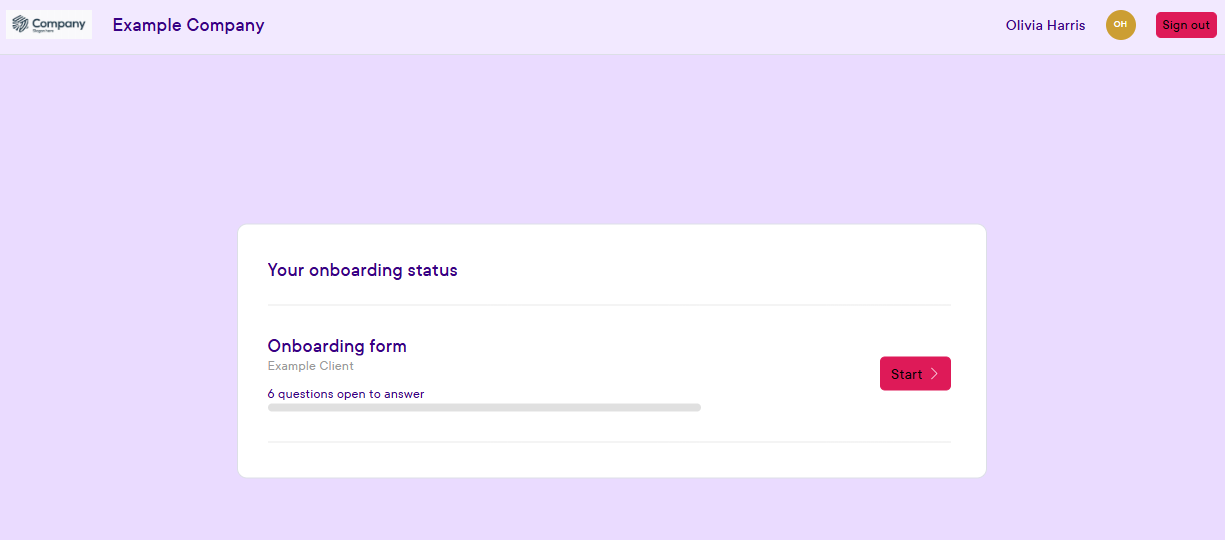 Thereafter the user can access the sent form in the Onboarding status overview. From here, the theme, company logo and name will be presented based on your set up External theme.