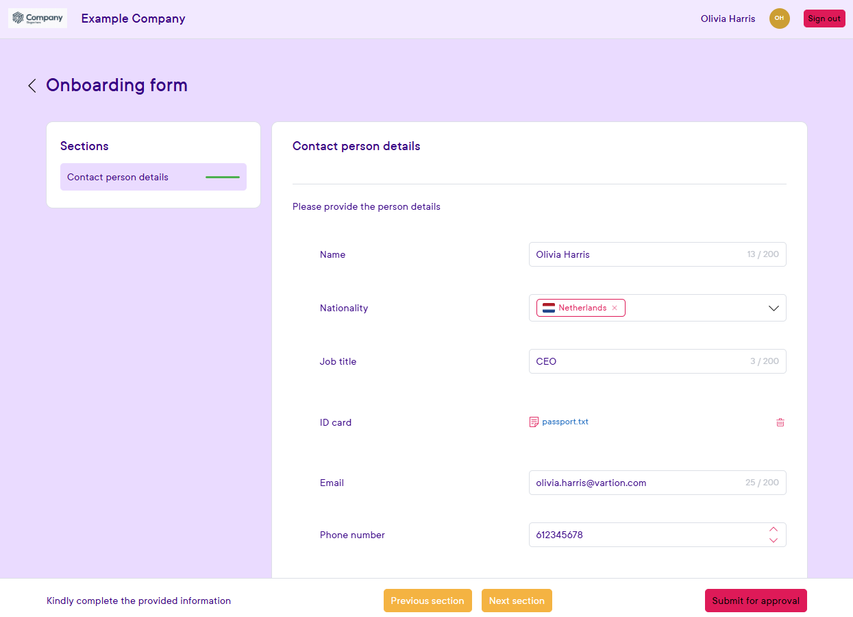 The user can press the Submit for approval button when all required questions are filled in. The form questions and answers can thereafter only be viewed by the user when visiting this site and verifying their account again.