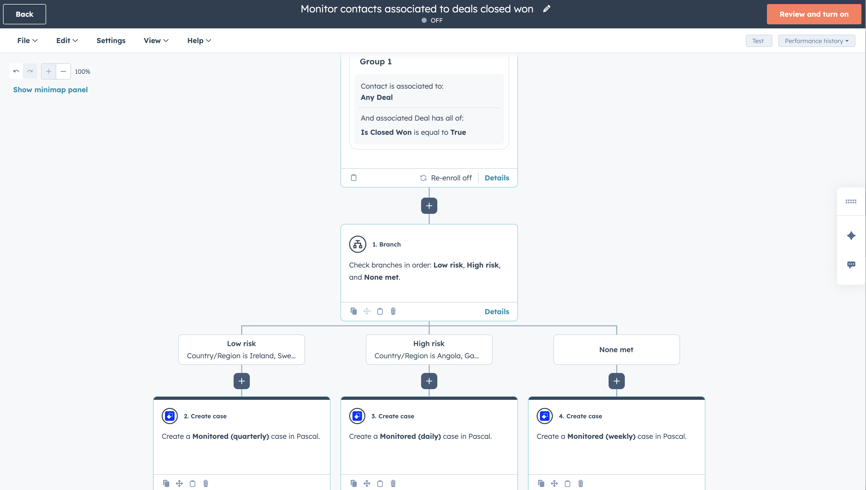 Monitored cases can be created or their status can be updated when company or contact records deals are closed. With specific properties their risk can be determined, with setting up branch configurations different monitoring frequencies can be chosen based on the riskiness of the contacts or companies.