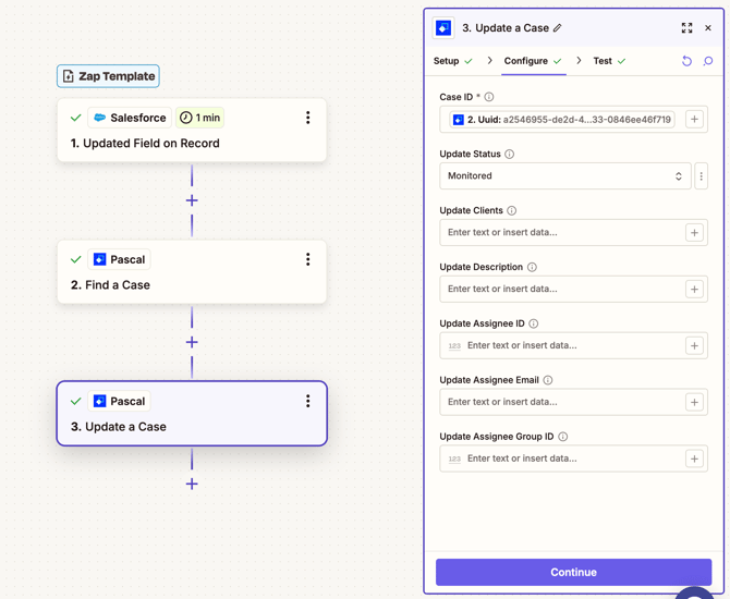 - Add an action Find a Case of Pascal. If you linked the Pascal UUID to your CRM record's notes, you can use this information to locate the specific case.