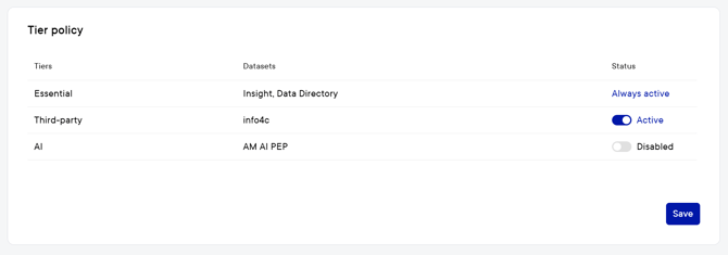 - Activate or deactivate a tier by clicking the toggle in the last column of the specific row.