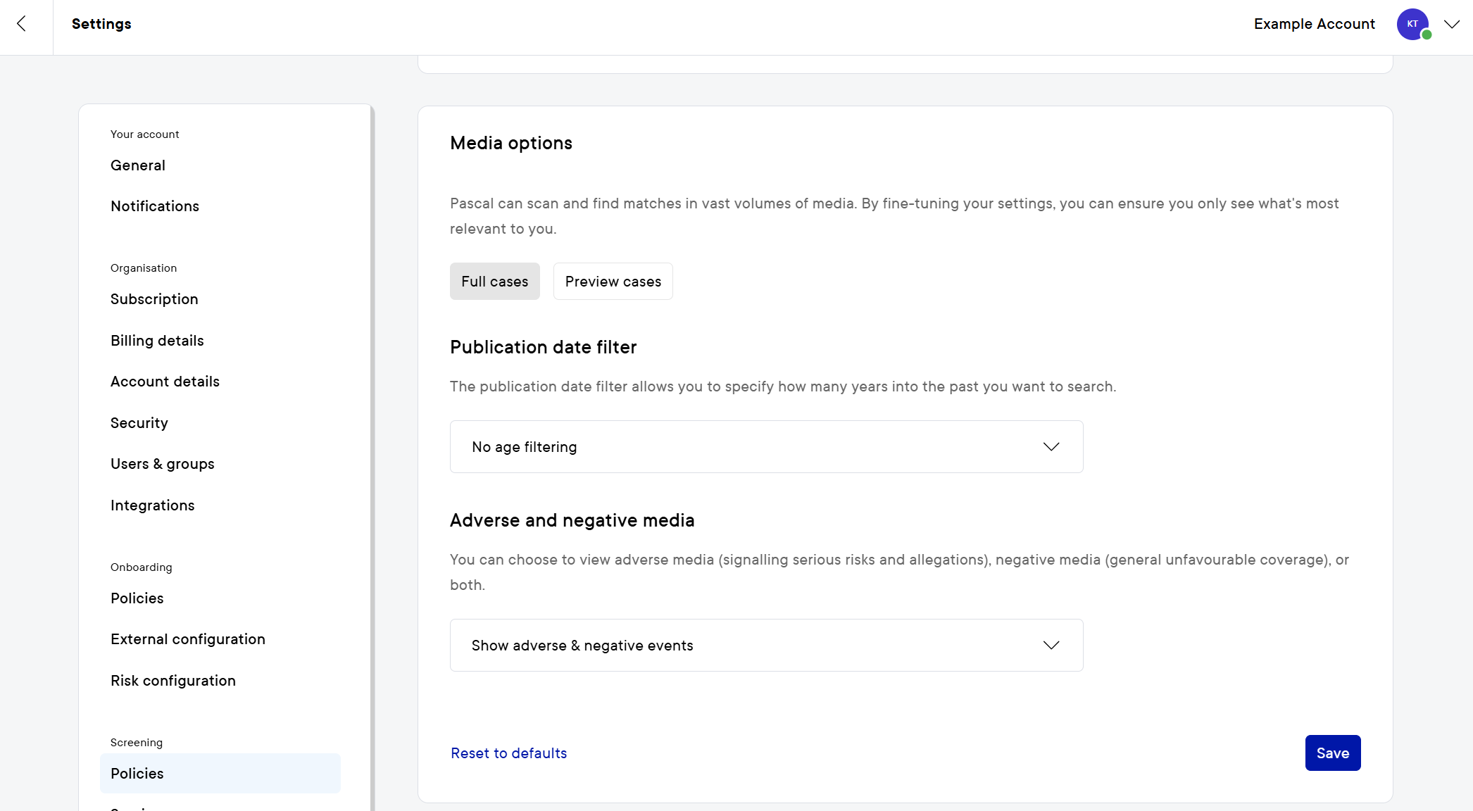 - Navigate to the Policies page in the Screening section and scroll down to the Media card.