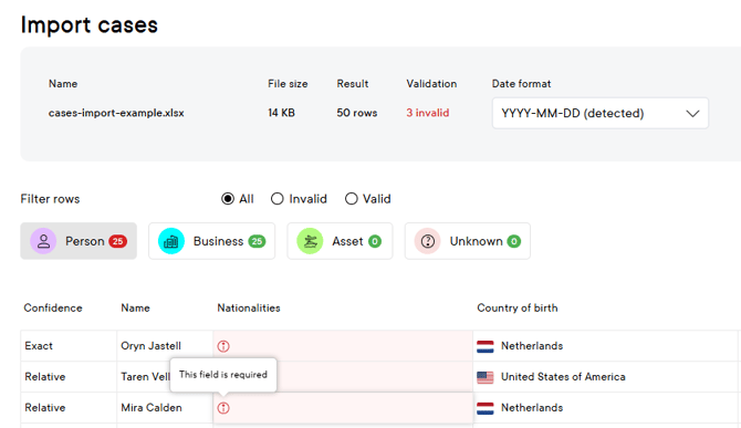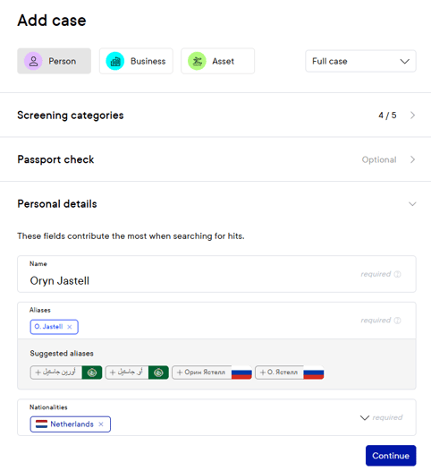 When creating a Person. Business or Asset case in Pascal Screening the Name field is required to provide. More details will improve the hits found in the case. Especially the fields in the Person details for Person cases, Business details for Business cases and Asset details for Asset cases.