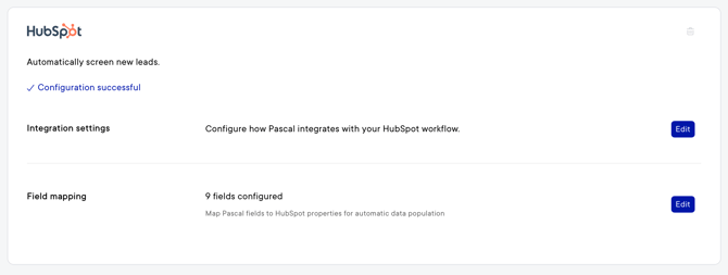 - Lastly, the HubSpot connection page shows the Pascal app settings & cards to configure in your HubSpot record overviews.
