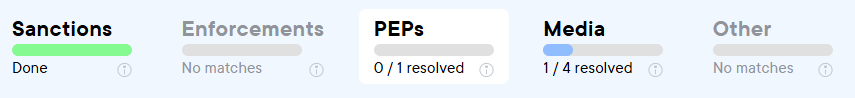 By pressing the Start resolving button in the resolving card you can start resolving hits in the case. Pascal has six different categories where hits can be found in: Sanctions, Enforcements, PEPs, Media and Other. Per source, a maximum of 100 hits will be presented during the initial screening. Sources will be greyed out when no hits in that source have been found for your case.