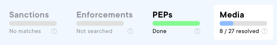 - Resolving - The resolve section in the case overview page gives you all the information regarding the hits found by the search. You can start resolving your hits by pressing the Start resolving button in this card. A red circle can appear on this card which indicates that a high risk hit or higher has been found in your case's hits. This view also gives an overview of the already resolved hits, a blue circle will appear around these buttons when an update of an already resolved hit occurred.
