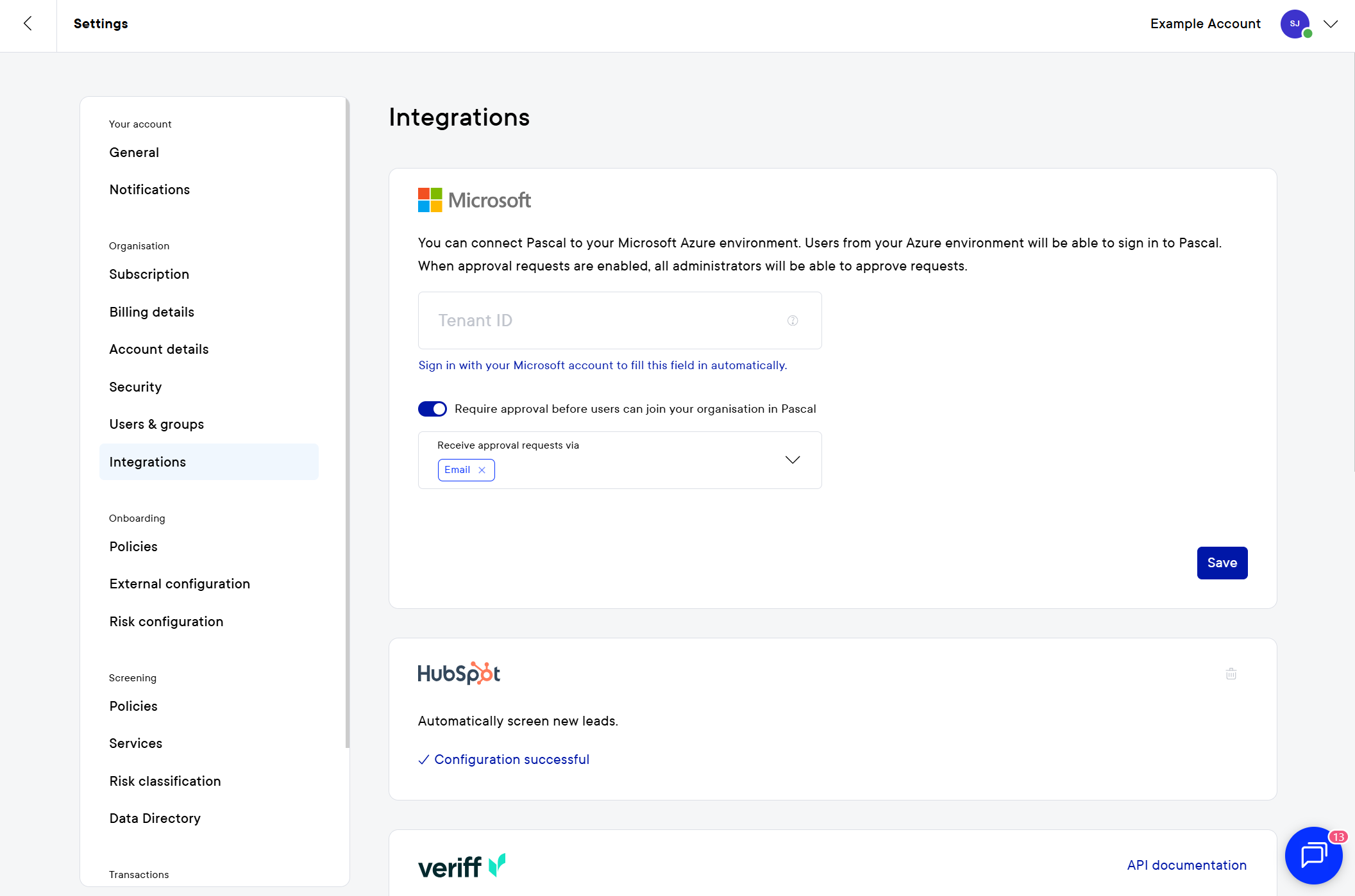 It is possible to first review which employees would like access to Pascal. Within the Integrations turn on the feature Require approval before users can join your organisation in Pascal. Users who sign in with Microsoft Azure will now first need to be approved before their account is active. An email is sent out to all admins and owners stating an approval needs to be given.