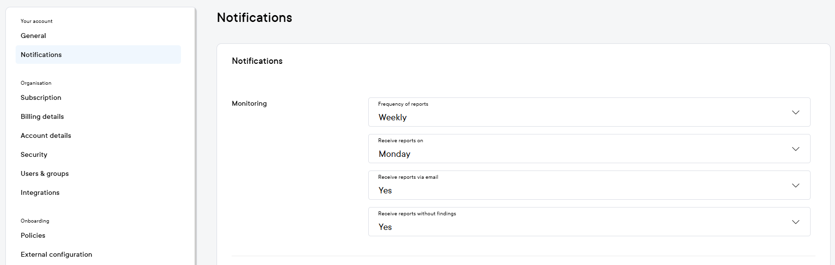 The frequency in which a user receives this report, can be customised in the Notification page in the Settings below the Your account section. The setting if the user prefers to receive the reports via email and without any new findings, can also be altered there.