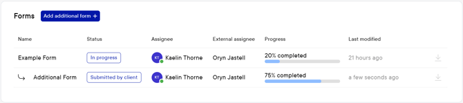 The Forms card shows all forms attached to this client. This could be one form or additional forms can be sent based on provided information or the type of client you are onboarding. Additional forms can be sent using the Add additional form button. Which allows you to select a form from your form templates and provide the name and email details of the person who the form will be sent to.