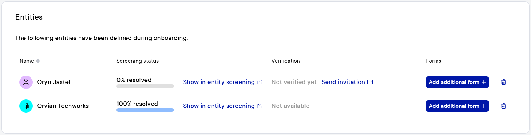 All entities identified in the answers of submitted forms are visible in the Entities card. Here, all relevant entities requiring screening can be screened by pressing the Add in entity screening. If a case of the entity already exists, the existing case will be prompted and can be selected to attach to the entity in this client onboarding. Otherwise a new case can be created. Person entities will have the option to Send invitation for the Verification section. The identity verification is only available when set up in the environment settings.