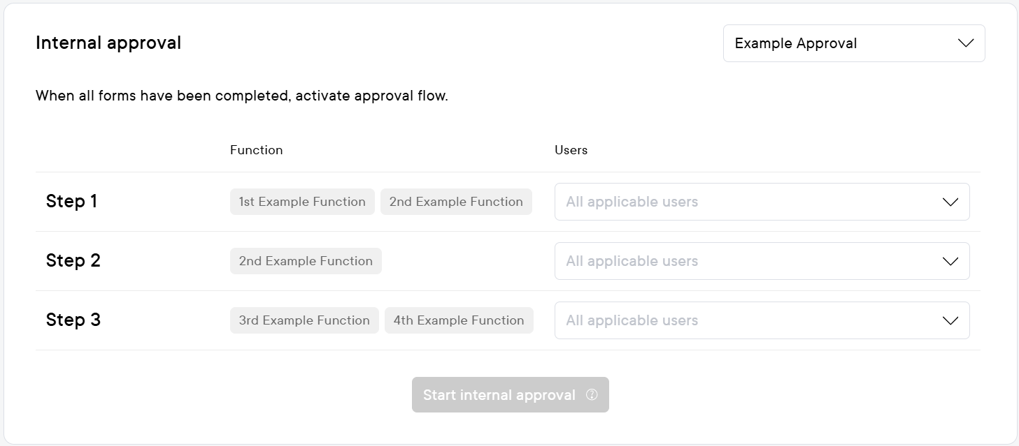 Should you wish to only notify specific users about the internal approval, selective users can be included in the Users column before pressing the Start internal approval button. All users with the indicated function will be able to approve the step, however only the selected users will receive a notification via email.