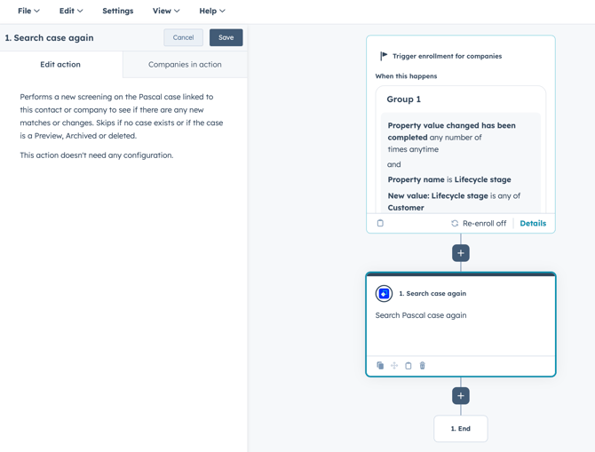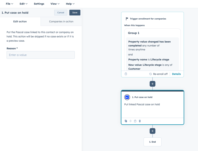 Within HubSpot, workflows allow a variety of automations. Several Pascal actions are available to create and manage cases. Records adhering to the set up triggers within these workflows can be used to create a case for, update the case and more. Pascal properties, available once the integration is set up, allow actions to follow when Pascal properties include specific values.